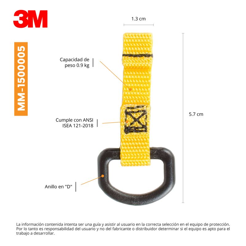 El anillo de conexión 1500005 de 3M DBI-SALA es excepcionalmente ligero y compacto, con dimensiones de solo 1.3 x 5.7 cm, lo que lo convierte en el accesorio de anillo en D perfecto para no añadir peso ni volumen a tus herramientas en trabajos de altura.