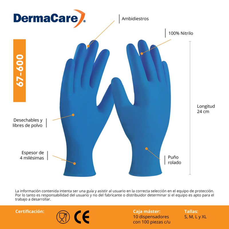 Los guantes de nitrilo azul desechables 67-600, marca DermaCare son perfectos para trabajos con grasas, aceites y sustancias químicas. Fabricados con nitrilo, ofrecen alta resistencia y agarre. Largo de 24 cm.